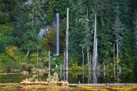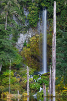 June Lake, found on the south side of Mount St. Helens, is essentially a large pond nestled against a significant cliff just below treeline near the terminus of a the "Worm Flows". The Worm Flows are a series of large lava flows which originated from vents below what is now the summit between 1530 and 1570. These porous lava flows effectively clogged the drainages on this side of the mountain and now as the copious winter snow melts it drains underground. Of the many spring sources where this water re-surfaces is June Lake Falls, where a stream seeps out of the cliffs lining June Lake and plunges a sheer 74 feet almost directly into the lake, framed by several picturesque snags. A second spring cascades down a talus slope about 200 feet south of the falls, and a third but much more seasonal waterfall can be found to the left of June Lake Falls.