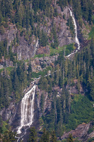 The two large lakes in the upper Bacon Creek drainage – Green Lake and Berdeen Lake – are situated at high elevations such that their outlets must drop over waterfalls of significant size in order to reach the floor of the valley. While the falls emanating form Green Lake are taller, Bacon Creek itself formally emerges from Berdeen Lake and is a larger stream. After it exits from Lower Berdeen Lake, Bacon Creek makes a sharp left-hand turn and plunges over the complex, multi-stepped Berdeen Falls. The uppermost tier is a narrow but nearly sheer plunge of some 325 feet (though potentially taller and possibly with some smaller tiers just above, though when surveyed from a distance we were not able to see any). At the base of the initial leap, the creek makes a sharp bend back to the right and commences a long sliding series of cascades where the creek drops another 200 feet. The cascades terminate immediately in the second major drop, a broad free-falling plunge of about 275 feet, and this is again followed by a series of steep cascades which drop another 100 feet, bringing the total drop of the falls to around 900 vertical feet.