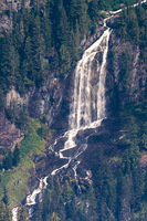 Bacon Creek at this point in its course is significantly smaller than at its mouth (where it is essentially a river), however the stream is continuously fueled by multiple sources which allow the volume to remain consistent throughout the year. Berdeen Lake, about three-quarters of a mile upstream, is one of the largest alpine lakes in the state of Washington and often remains entirely frozen until August. Additionally, four modest glaciers on the east face of Hagan Mountain provide an ample inflow to the creek when (or if) the winter snowpack melts off. The falls are resoundingly more impressive in the early summer months, but flow well all year.