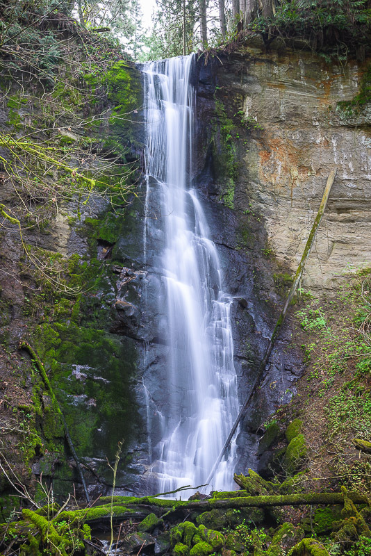 Bulson Creek Falls is a low volume but rather significant waterfall set in the hills just east of Interstate 5 along the southern margin of the Skagit River Delta south of Mount Vernon. The falls plunge a nearly sheer 64 feet over an amphitheater-like sandstone cliff into a narrow gully framed with a surprisingly lengthy set of cliffs which guard the creek along the south side of the ravine.