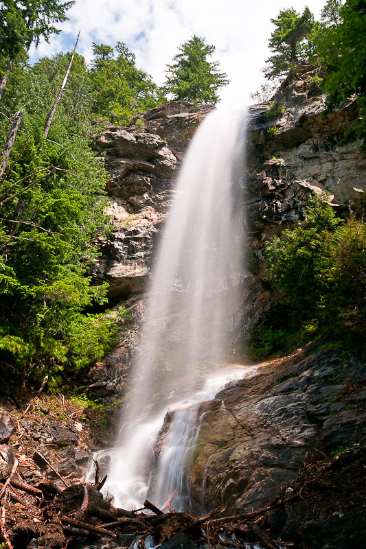 Buster Brown Falls is one of those out-of-the-way gems that very few people know about and even fewer have actually seen. I'd personally known of the falls for about 4 years but had never had a chance to seek it out until 2009. The falls are situated on a seasonal stream that drains off the southwest side of Sourdough Mountain. Where this stream intersects Sourdough Creek itself, it plunges 165 feet over a lofty cliff. The falls are actually in all likelihood well over 250 feet tall, but the upper portions of the falls can only be seen from Highway 20 across the lake, so there is no way to verify the height of any upper extremities of the falls. Because the drainage basin is very steep and quite small, the falls are limited to flowing during snowmelt season and usually run dry by the middle of July, if not sooner. The second hurdle to visiting this waterfall is the access restrictions to the Diablo Dam road, which is gated daily at 4:30pm, so be sure to allot enough time to hike in and out before the gate closes.
