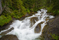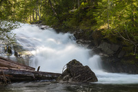 Camp Robber Cascades are accessed from the Lake Dorothy Trail at the end of the Miller River Road near Skykomish. Turn off Highway 2 at the Old Cascade Highway at Money Creek, either 2 3/4 miles west of Skykomish or 3/4 of a mile east of Grotto. Proceed a mile and turn right (south) on Miller River Road. The Lake Dorothy Trailhead is at its end about 9 miles further. Hike in along the trail for about 3/4 of a mile to the bridge across Camp Robber Creek which bisects the two sections of the falls - the upper being visible from the bridge, and the lower visible from just off the trail about 200 feet before the bridge.