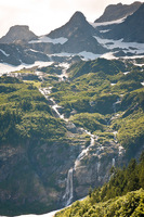 Colonial Creek is, at first glance, a fairly discrete creek emptying into the placid waters of Diablo Lake's Thunder Arm. But looking up its valley from the right places one can glimpse portions of what is thus far the tallest waterfall recorded in the continental United States. As Colonial Creek drains from the lake forming in place of the retreating Colonial Glacier, it slides over the lip of the valley's headwall, plunging and skipping a total of 2,568 feet in 13 distinct steps before reaching the floor of the basin. Because of the height involved with the falls, as well as the fact that there are multiple steps and breaks in the consistency of the gradient, the falls have a considerable overall run (over 4,200 feet) which gives Colonial Creek Falls an average pitch of about 65 degrees. However, many of the distinct tiers of the falls are over 75 degrees in slope, with the uppermost drop starting out as a very steep horsetail, and the final tier of the falls breaking into two distinct segments, each featuring a 300 foot sheer free-fall.