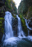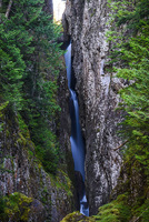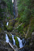 Deadhorse Creek drains the basin between Cougar and Skyline Divides on the north side of Mount Baker and as the creek does not have a source in permanent ice melt or the outlet of a lake, the erosive power of the stream isn't nearly as great as neighboring drainages. As the creek encountered the valley of the North Fork of the Nooksack River it was left hanging well above the floor and as a result carved a very deep, exceptionally narrow canyon as it plunged down to the valley. At the head of the canyon lies this waterfall, a lofty but very difficult to see and truly appreciate waterfall of nearly 400 feet in all.