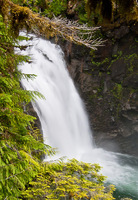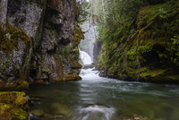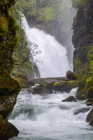 At Deer falls the North Fork hurtles over the lip of the canyon in a narrow stream before impacting on a small ledge, causing the water to explode outward in a huge booming roar, falling 84 feet into a massive amphitheater coated head to toe in moss. Below the falls the river flows through a section of the canyon so narrow that there is no way to pass upstream at river level, thus limiting views from downstream to a considerable distance away.