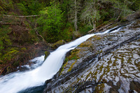 Heaven and Hell Falls is located about 6 miles northwest of Stevenson along Rock Creek Road. Take Highway 14 one mile west of Stevenson to Rock Creek Drive (also signed as Second Street or Foster Creek Road in some places) and turn north, passing the Skamania Lodge and Resort (use this as a landmark for the proper turnoff). In ¾ mile, turn left onto Ryan Allen Road. Follow this road for about a mile, then turn left onto Red Bluff Road, which eventually becomes Rock Creek Road. Follow this gravel road for 5.8 miles (staying left where a road drops to the right about 2-1/2 miles in). Watch for the falls on the left, about 1/3 of a mile after the bridge crossing Rock Creek at Steep Creek Falls, and a path leading 100 feet to a campsite at the top of the falls shortly after.