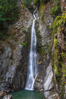 Lake Creek is a tributary of the Baker River which runs out of Shuksan Lake and cascades nearly 3,000 feet in just over a mile before merging with the river just below the Baker River Trail. While the majority of this lofty drop is, surprisingly, just steep cascades down a talus-choked gully, the creek makes an impressive and surprisingly scenic plunge over this 166-foot tall waterfall as it nears the valley floor. The falls are made up of two distinct drops - a 45-foot tall horsetail tucked in a narrow grotto which can barely be seen, followed by a 121-foot tall plunge which first chutes out of the narrow gorge above and then pitches into a near free-fall to a small blue pool below. During high water periods it is likely that this tier of the falls will feature a powerful roostertail, with the stream shooting out several dozen feet from the cliff face as it enters the free-fall.