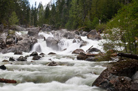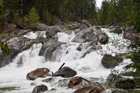 Little Wenatchee Falls is the ultimate two-faced waterfall. I had passed through the area several times prior to visiting the falls, but usually opted to write it off because it had been given a one star rating in "A Waterfall Lovers Guide to the Pacific Northwest". After visiting the falls twice, I can see why it would land such a rating yet I can't understand how a waterfall so significant can go so overlooked for so long, especially considering the popularity of the Wenatchee River in nearby Tumwater Canyon as a rafting destination. First of all, the falls are much larger than initial impressions let on. The Little Wenatchee River cascades over a series of progressively taller ledges totaling about 60 feet in height in about 300 feet of run. The formation stretches over 200 feet wide at the bottom of the falls. The reason the falls are so overlooked is the one well worn boot path that leads to the top of the falls doesn't allow one to see more than the top 5-10 feet of the falls. From the base of the falls, however, a much more impressive picture is painted. The Little Wenatchee can move a fair amount of water - easily cresting a thousand cubic feet during the spring melt - but because the drainage is largely runoff dependant, the river loses a lot of its power late in the season and the falls will become much less impressive as the year progresses.