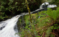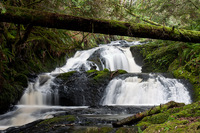 From the west end of the Hood Canal Bridge, drive west on WA-104 for about 5 miles then turn right (north) onto WA-19, signed for Ports Ludlow and Port Townsend. Continue for 1-3/4 miles and turn right onto Oak Bay Road (again, signed for Port Ludlow). In another 1.2 miles turn right at Breaker Lane, then take the second right (the first is the entrance to the Port Ludlow RV Park) onto a gravel drive and follow it to a small parking area at its end, adjacent to a small park with a garden. The trail embarks here, and makes a loop past the falls - follow the loop trail counter-clockwise to reach the falls fastest in about 1/4 of a mile.