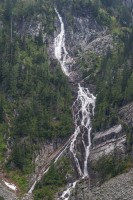 Rock Creek Falls is viewed from the Rock Creek Trail, which can be accessed either from the Middle Fork Snoqualmie River trail, or from the Snow Lake Trail starting from Snoqualmie Pass. The approach from the Middle Fork is shorter, but usually requires a high clearance vehicle to reach the trailhead. The approach from Snoqualmie Pass is accessible to all vehicles, but involves a longer hike and more elevation change. From the Middle Fork side, drive to the Dingford Creek Trailhead at the end of the Mdidle Fork Snoqualmie Road (Forest Road 56), the last 5 miles of which usually require high clearance due to frequent washouts, water bars, and enormous potholes. Hike the Dingford Creek Trail downstream for one-quarter of a mile from the parking area and cross the Middle Fork on a bridge, then bear left at the first fork and continue east towards Goldmyer Hot Springs along the Middle Fork Trail for another 2-1/2 miles to the junction with the Rock Creek Trail. Take the Rock Creek trail, which climbs moderately, for an additional 1.3 miles to where it makes a sharp switchback adjacent to a large rock slide area. The best views of the falls are had from the rock slide, a few feet off the trail. From the Snoqualmie Pass side, start at the Snow Lake Trailhead adjacent to the Alpental Ski area. Hike the Snow Lake Trail for 3.3 miles to the signed junction with the Rock Creek Trail (before crossing the outlet of Snow Lake), then follow the Rock Creek Trail downhill until the falls come into view. The best views of the falls will be had around 2 miles from the junction.