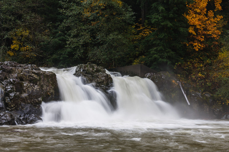 Salmon Falls is the largest waterfall along the Little North Santiam River, as well as the river's natural barrier to upstream fish migration. The falls drop 24 feet in a pair of side-by-side plunges with a fish ladder bypassing the falls on the far bank. Fortunately the ladder is more or less enclosed within the natural bedrock and only a small concrete structure is visible to indicate the presence of human interference. A small county park provides access to the falls as well as picnic facilities. As of November 2012 part of the short trail leading down to the river below the falls was heavily eroded and may become potentially hazardous without repair, so visitors are urged to exercise the appropriate cautions.