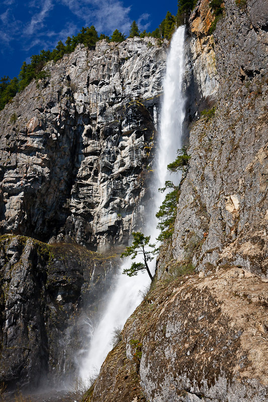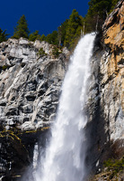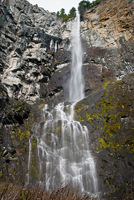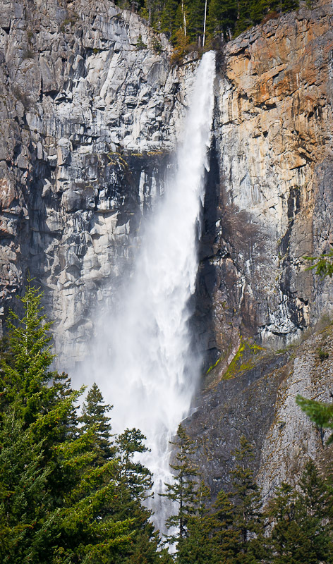 The falls consist of two distinct leaps; the first a sheer plunge of 300 feet over a jagged cliff, and the second a 180 foot tall veil where the creek spreads out into dozens of tiny rivulets after impacting on a ledge, spreading out over 60 feet in width as it veils to the talus slope below. During periods of exceptionally heavy flow the falls may leap entirely free of the ledge which separates the two tiers, allowing the falls to drop for a sheer 480 feet without interruption. We were fortunate enough to witness such an occurrence in May of 2008 when record high temperatures induced a fury of snowmelt in the area, and turned Snoquera Falls into a violent sheer plunge waterfall in stark contrast to its norally delicate nature (do not expect this kind of behavior to be commonplace however).