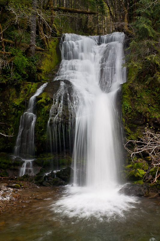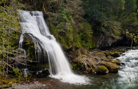 Steep Creek Falls is located about 5 miles northwest of Stevenson along Rock Creek Road. Take Highway 14 one mile west of Stevenson to Rock Creek Drive (also signed as Second Street or Foster Creek Road in some places) and turn north, passing the Skamania Lodge and Resort (use this as a landmark for the proper turnoff). In ¾ mile, turn left onto Ryan Allen Road. Follow this road for about a mile, then turn left onto Red Bluff Road, which eventually becomes Rock Creek Road. Follow this gravel road for 5-1/2 miles (staying left where a road drops to the right about 2-1/2 miles in) to a bridge crossing Rock Creek, with the falls on the left.