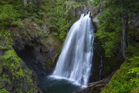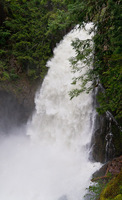 Though not exceptionally large, Thunder Falls is one of the most pristine waterfalls in the Mount Rainier area. Summit Creek creates a waterfall which fully lives up to its name as it fans out in a remarkably symmetrical fashion, dropping 82 feet into a lush natural amphitheater. Though the appearance of the falls doesn't change terribly with an increase or decrease in the volume of the creek, the character of the falls does vary greatly. Late in the summer when the volume of Summit Creek is at its lowest, the falls take on an exceptionally graceful and tranquil persona as it spreads out into thousands of rivulets and drips. In contrast, between May and July when the snowmelt season is in full swing, the creek balloons to nearly a full size river and the falls swell with immense power, the water shooting clear of the cliff and plunging in a free-fall to the pool below in a deafening roar.
