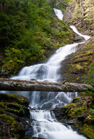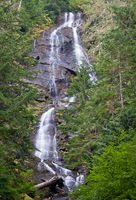 Twin Falls is a rather significant but long forgotten waterfall found along Lookout Creek on the north side of Mount Baker. The falls have a cumulative drop of approximately 565 feet in multiple steps, with the stream bifurcating into two channels below the uppermost tier of the falls and tumbling the remainder of its cumulative height in side-by-side falls separated by a dense island of forest. Viewed from the base of the falls, the northernmost segment features several tiers which tumble in a zigzagging pattern for approximately 190 feet, while the southern segment veils in a more or less singular horsetail style fall for about 275 feet. The upper sections of the falls cannot be seen from below, but are clearly evident on high resolution topographic models derived from lidar data. The entire waterfall is unfortunately hidden from view from the Glacier Creek Road despite its size and relatively close proximity.